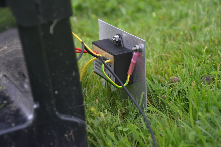 Åskskyddet placeras bakom robotgräsklipparens laddstation och kopplas in med hjälp av den medföljande kopplingsinstruktionen.