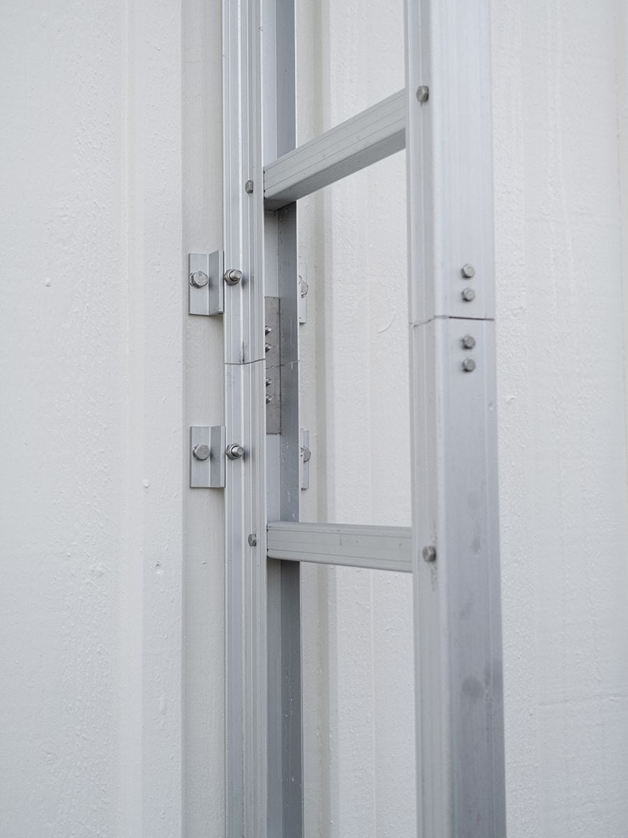 Tillverkad i aluminium och rostfritt stål, ger stegen en robust och väderbeständig konstruktion som är säker att klättra på. Med en bredd på bara 47 mm tar den minimalt med plats mot fasaden och fungerar på alla fasadtyper. Stegen fälls ut ovanifrån vilket förhindrar obehörig användning.